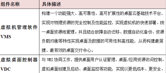 虛擬桌面控制器VDC:提供桌面用戶認證管理、桌面/應用資源訪問控制、虛擬桌面創 建及啟動、桌面監控等功能,實現以更低成本、更安全、更可靠地交付Windows桌面;需與VMS協同工作,并提供軟件和硬件兩種類型。